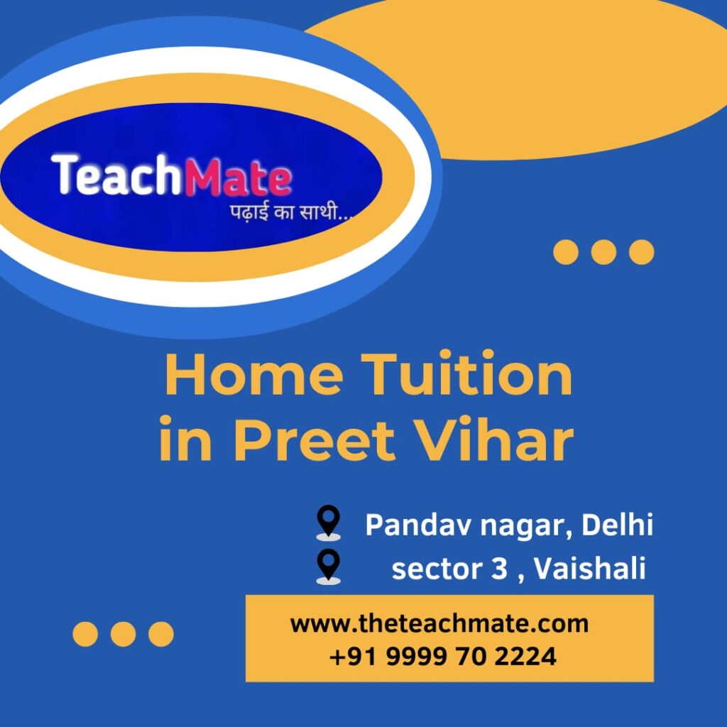 TeachMate offers home tuition in Preet Vihar from Nursery to Class 12. Also We offer graduation courses. We cover all major subjects including Maths, Science(PCMB), English, Hindi, Social Science, Accounts and Economics. Our expert tutors are available for board exam preparation and college entrance exams also